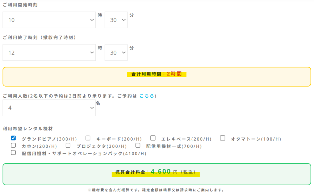 当スタジオの料金体系は「平日昼夜の切り替え」「3h・5hパックの適用」「16時をまたぐ計算」など複雑な部分があり、特に初めてご利用の方には総額の計算がご不便をおかけしておりました。