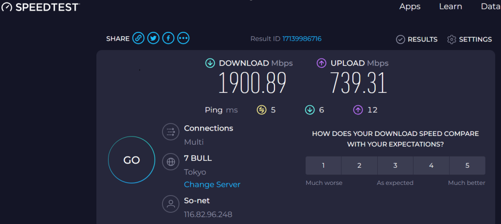 インターネットスピードテスト(speedtest.net)実効 Download 1900Mbps Upload 739 ping 5ms